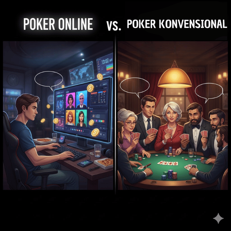 Perbedaan poker online dengan poker konvensional ada di tempo, alat baca, biaya, dan ekosistem.